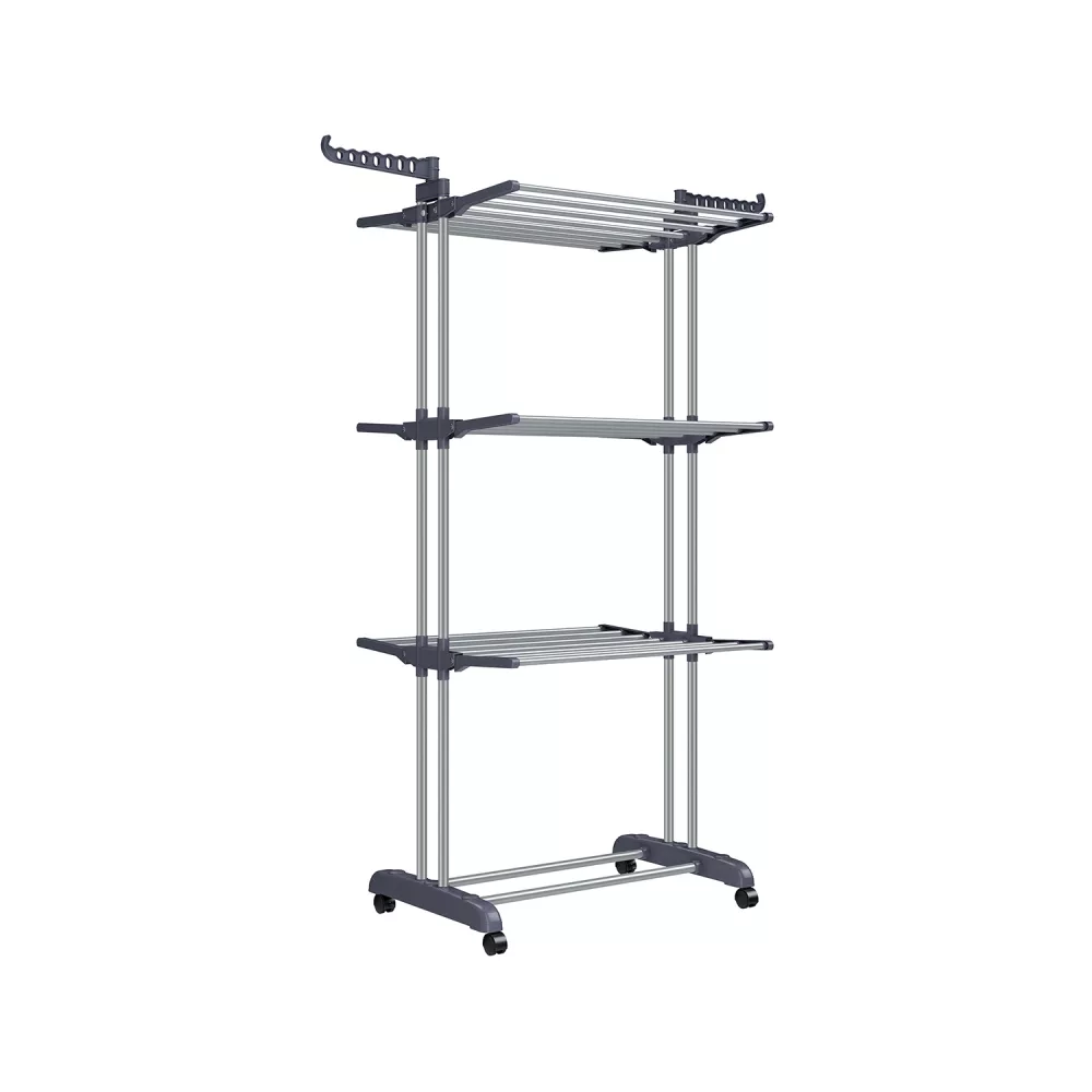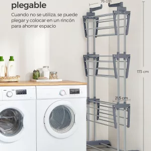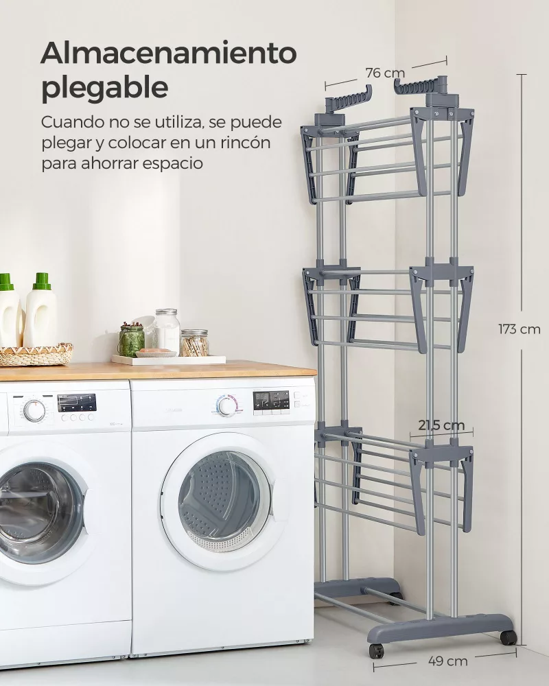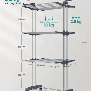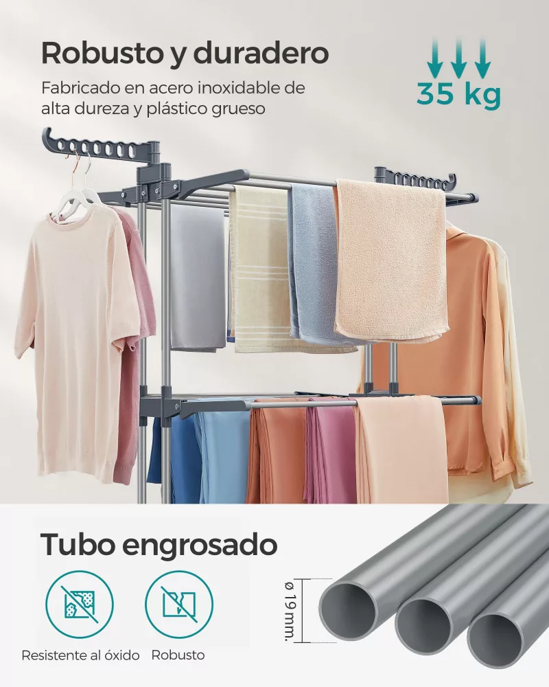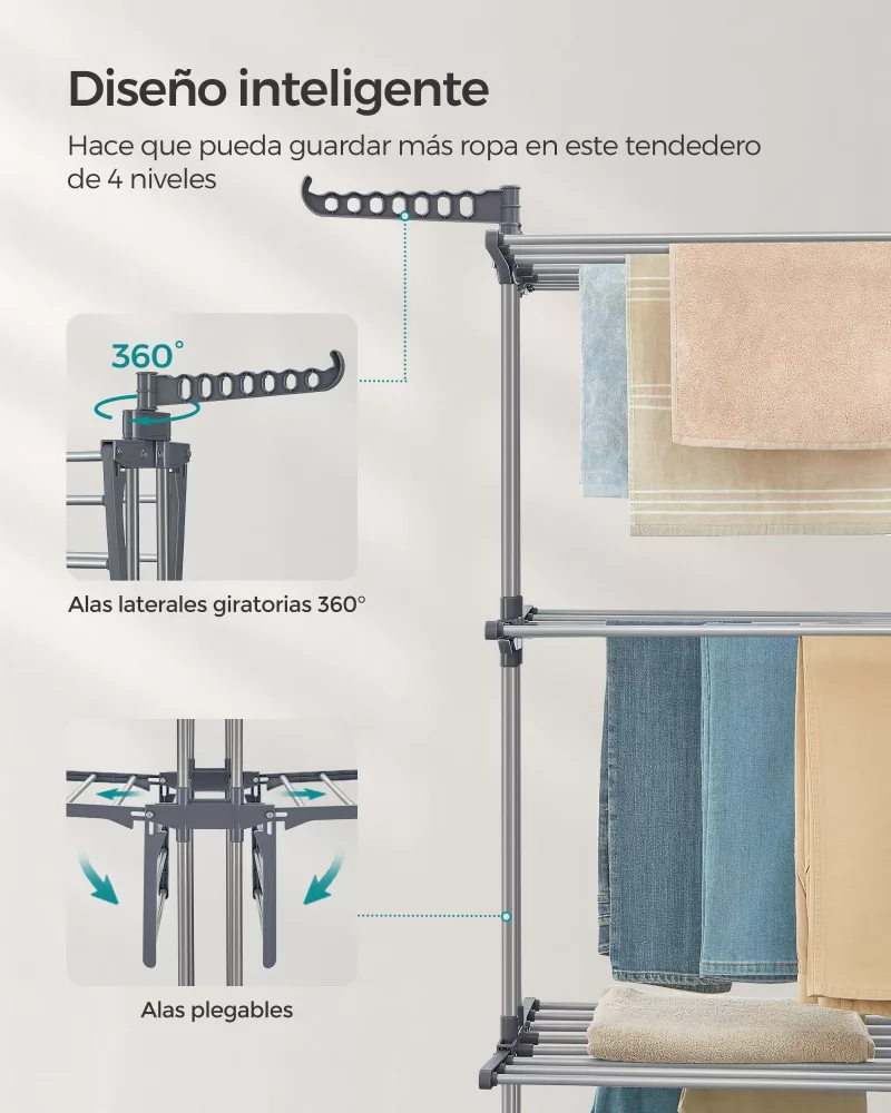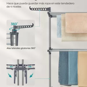 Aprovecha al máximo el espacio para secar tu ropa con este tendedero de 4 niveles, diseñado para ofrecer gran capacidad y facilidad de uso. Con alas giratorias, ruedas bloqueables y una estructura robusta, es ideal para interiores o exteriores, proporcionando una solución versátil para tu hogar.