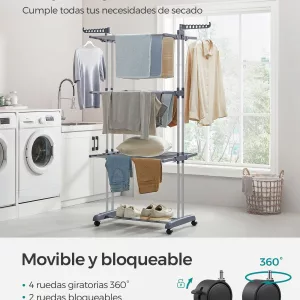 Extraíble y Bloqueable: Equipado con 4 ruedas en la base, puedes mover fácilmente el tendedero donde lo necesites. Dos de las ruedas cuentan con frenos bloqueables para mantener el tendedero en su lugar, brindando estabilidad adicional cuando sea necesario.