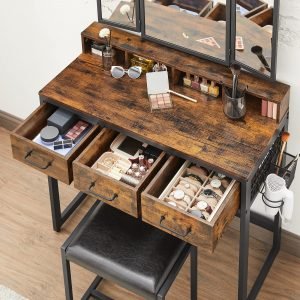 Un elegante tocador con espejo triple, fabricado en aglomerado y acero para máxima estabilidad, junto con un taburete acolchado para tu comodidad. ¡Prepárate para transformar tu rutina de belleza!