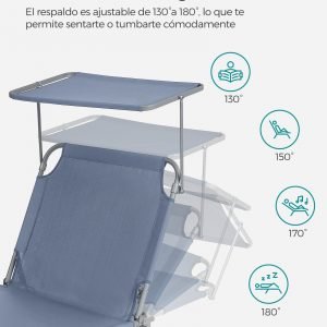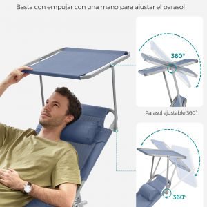 Sombrilla Ajustable: Incluye una sombrilla regulable que puedes ajustar fácilmente con la mano para bloquear el sol y leer o relajarte sin deslumbrarte. La sombra adicional permite una experiencia más cómoda bajo el sol.