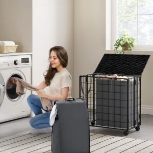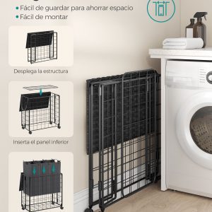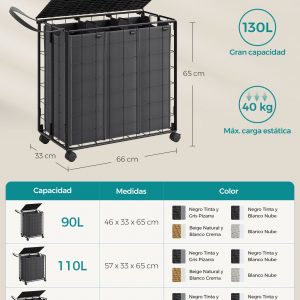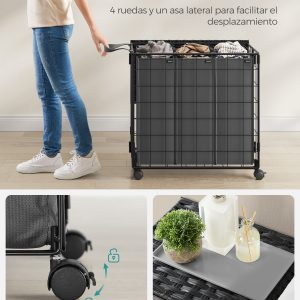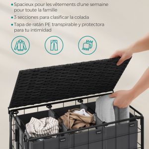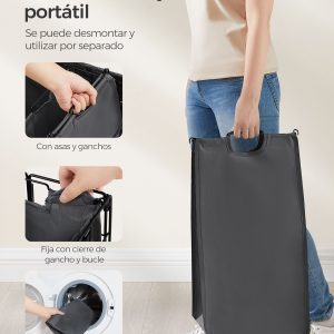 La bolsa interior de tela Oxford es removible, lo que facilita su uso y limpieza. Es portátil gracias a sus asas de metal y se puede lavar en la máquina. Su diseño de 3 compartimentos permite separar las prendas de manera eficiente, ayudando en la organización de la colada.