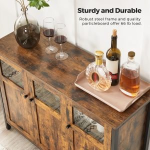 Construcción Duradera: Diseñado para ser un invitado permanente en tus reuniones familiares, este buffet promete durabilidad y resistencia. Los tableros de aglomerado de calidad están soportados por un marco de acero robusto, asegurando que el armario pueda soportar momentos memorables de comidas prolongadas y discusiones interminables.