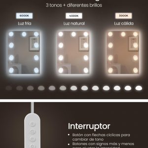 Iluminación Personalizable: Con 9 bombillas que ofrecen 3 tonos diferentes e intensidad ajustable, este tocador te permite encontrar la iluminación perfecta para cualquier momento del día o noche.