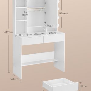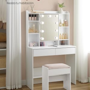 Descubre el equilibrio perfecto entre funcionalidad y estilo con nuestro Tocador con Luces y Amplio Espacio de Almacenamiento, diseñado para ofrecerte la experiencia de belleza definitiva. Este mueble, que combina un diseño elegante con características prácticas, es el complemento ideal para tu dormitorio o vestidor, proporcionando todo lo necesario para organizar tus productos de belleza y accesorios con facilidad.