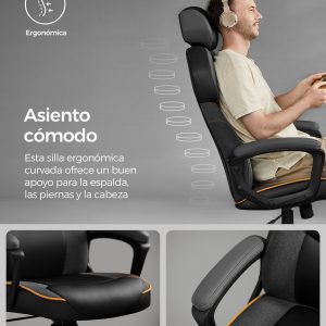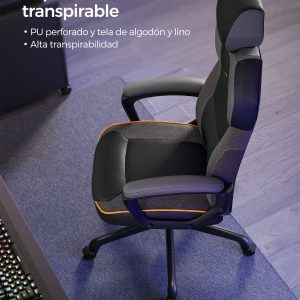 Inspirada en los asientos de coches de carreras, la combinación de PU negro, tejido de algodón y lino, junto con líneas naranjas, otorga a esta silla un aspecto deportivo y elegante, ideal para cualquier sala de juegos o entorno de oficina moderno.