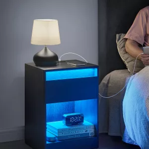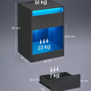 Transforma el ambiente de tu dormitorio, sala de estar o sala de juegos con esta Mesilla de Noche con Tiras LED Dobles y Estación de Carga. Con un diseño moderno y funcional, combina almacenamiento práctico, iluminación personalizable y una estación de carga integrada para satisfacer todas tus necesidades.