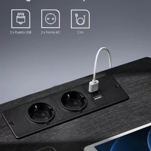 Estación de Carga Integrada: Olvídate del desorden de cables con la regleta integrada que incluye 2 tomas AC, 2 puertos USB y un cable de extensión de 2 metros. Carga hasta 4 dispositivos simultáneamente desde la comodidad de tu cama o sofá. Además, la caja de cables en la parte posterior mantiene todos los cables ocultos, ofreciendo un aspecto limpio y ordenado.