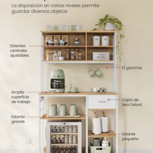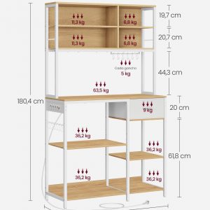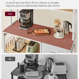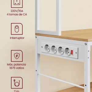 Esta estantería de cocina multifuncional no solo maximiza el espacio de almacenamiento y preparación en tu cocina, sino que también brinda seguridad y conveniencia gracias a sus características integradas. Con una regleta de 4 tomas de CA y una capacidad de soportar hasta 1875 vatios, esta estantería asegura que tus electrodomésticos estén siempre al alcance y protegidos gracias a su sistema de seguridad que incluye protección contra sobrecargas y fugas de corriente.