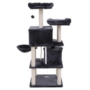 Rascador para gatos con plataforma, cueva y postes de sisal, gris