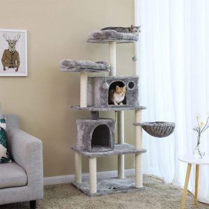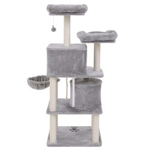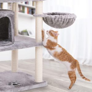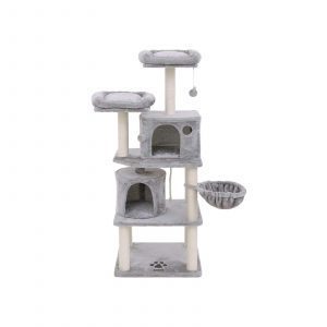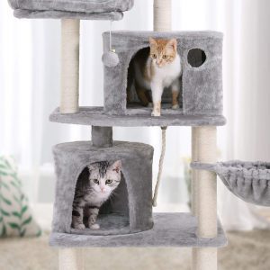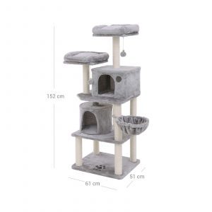 Este árbol para gatos ofrece a tus amigos felinos una experiencia de lujo, con dos escondites espaciosos, una cesta flotante y varias plataformas diseñadas para jugar, echar siestas y saltar. Las plataformas superiores cuentan con bordes elevados para que tus gatos puedan descansar cómodamente apoyando la cabeza mientras observan su entorno.