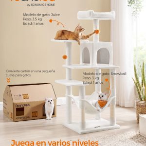 Este árbol para gatos ofrece a tus felinos amigos un lugar cómodo y divertido para jugar, observar y descansar. Con sus 2 plataformas con bordes acolchados, una cueva acogedora y una hamaca suave, este árbol se convertirá en el rincón favorito de tus gatos.