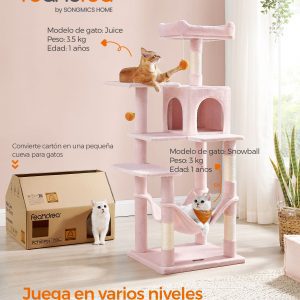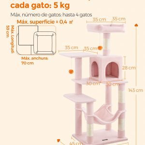Este árbol para gatos ofrece a tus felinos amigos un lugar cómodo y divertido para jugar, observar y descansar. Con sus 2 plataformas con bordes acolchados, una cueva acogedora y una hamaca suave, este árbol se convertirá en el rincón favorito de tus gatos.