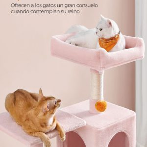 Hamaca Suave y Cómoda: La hamaca de felpa envuelve cómodamente a tu gato, brindándole un lugar cálido y tranquilo para disfrutar. Esta característica hace que el árbol sea aún más atractivo para tus felinos amigos.