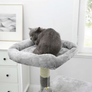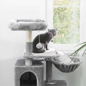 Casa de Ensueño: El árbol para gatos cuenta con una percha acolchada superior que funciona como una suite espaciosa, mientras que la parte inferior es un auténtico patio de recreo. Después de un almuerzo bien disfrutado, tus gatos pueden tomar una siesta en la tumbona de la canasta o relajarse en la cueva privada de la torre.