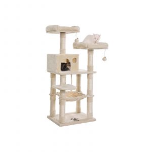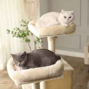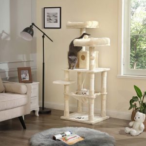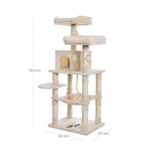 Este condominio para gatos ofrece a tus amigos felinos un espacio exclusivo para trepar, jugar y relajarse. Con dos miradores de peluche, una hamaca grande y estable, y múltiples niveles, este árbol para gatos es perfecto para satisfacer las necesidades de tus gatos, jóvenes y viejos.