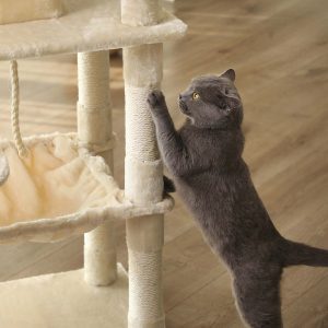 Materiales de Calidad: Hecho de felpa gruesa, sisal resistente a los arañazos y robustos tableros de madera de ingeniería, este árbol para gatos cuenta con materiales que impresionarán incluso al gato más exigente.