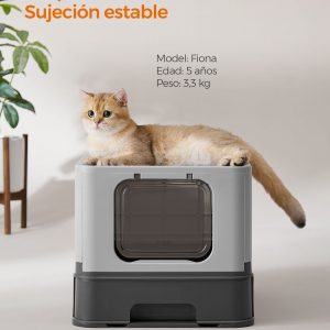 Con dimensiones interiores de 50 x 40,5 x 34,5 cm, ofrece amplio espacio para gatos de mayor tamaño, garantizando que incluso los felinos más grandes o robustos encuentren su lugar cómodo para hacer sus necesidades. La parte superior es resistente, soportando hasta 15 kg, adecuada para gatos de todos los tamaños.