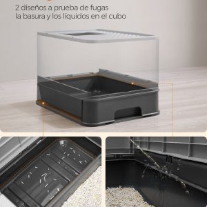 Gracias a su borde extendido y fondo cerrado, esta caja de arena asegura que todo permanezca dentro, incluso si tu gato tiene la costumbre de escarbar o hacer sus necesidades de pie. Esta característica es esencial para prevenir fugas y mantener el área alrededor de la caja de arena impecable.
