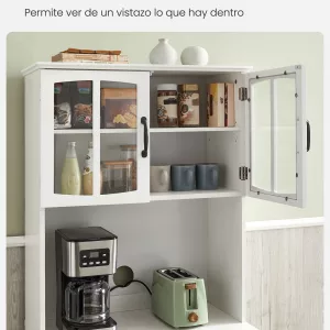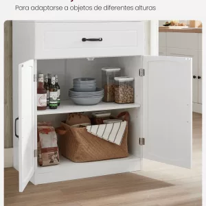 Optimización de espacio: A pesar de su tamaño compacto, incluye un compartimento superior para exhibir juegos de café, un estante para microondas, un cajón para objetos pequeños y un compartimento inferior para utensilios de cocina.