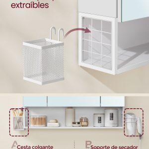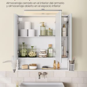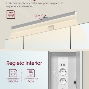 Conectividad Integrada: Dotado de dos orificios de AC y dos USB en su interior, este armario te permite cargar cepillos de dientes eléctricos y maquinillas de afeitar, manteniendo tus dispositivos listos para usar.