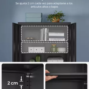 Baldas ajustables: Equipado con 4 baldas que se pueden ajustar en altura según tus necesidades, permitiendo almacenar artículos de diferentes tamaños y alturas.