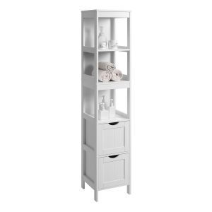 Armario de baño alto con cajones y estantes abiertos, blanco