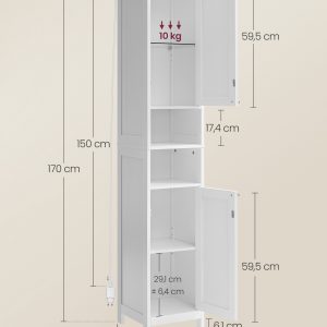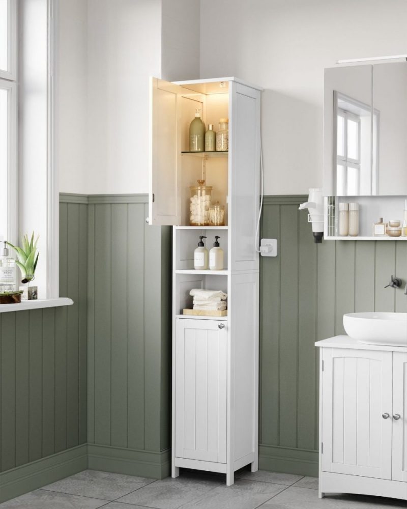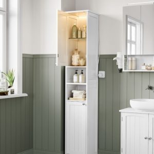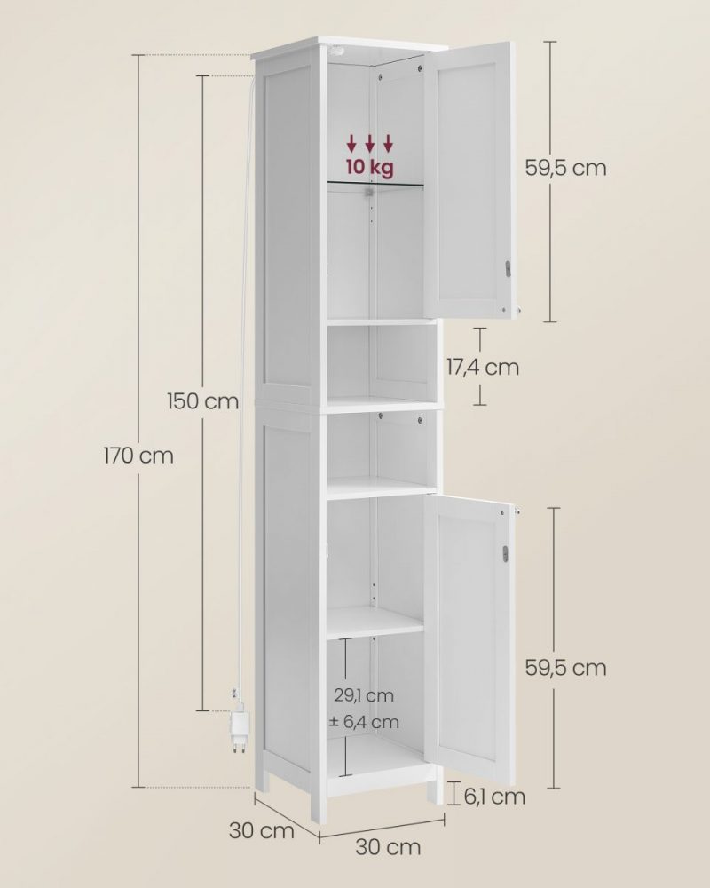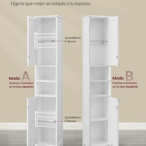 Este armario de baño de diseño inteligente y espacio-eficiente es una solución ideal para maximizar el almacenamiento en espacios pequeños. Sus luces incorporadas, activadas automáticamente al abrir las puertas, facilitan la búsqueda de objetos incluso en áreas poco iluminadas. Con una estructura estrecha pero alta (30 x 30 x 170 cm), este armario ofrece una gran capacidad de almacenamiento sin ocupar mucho espacio. Además, sus estantes ajustables y las opciones de montaje de puertas flexibles lo hacen adaptable a cualquier entorno.