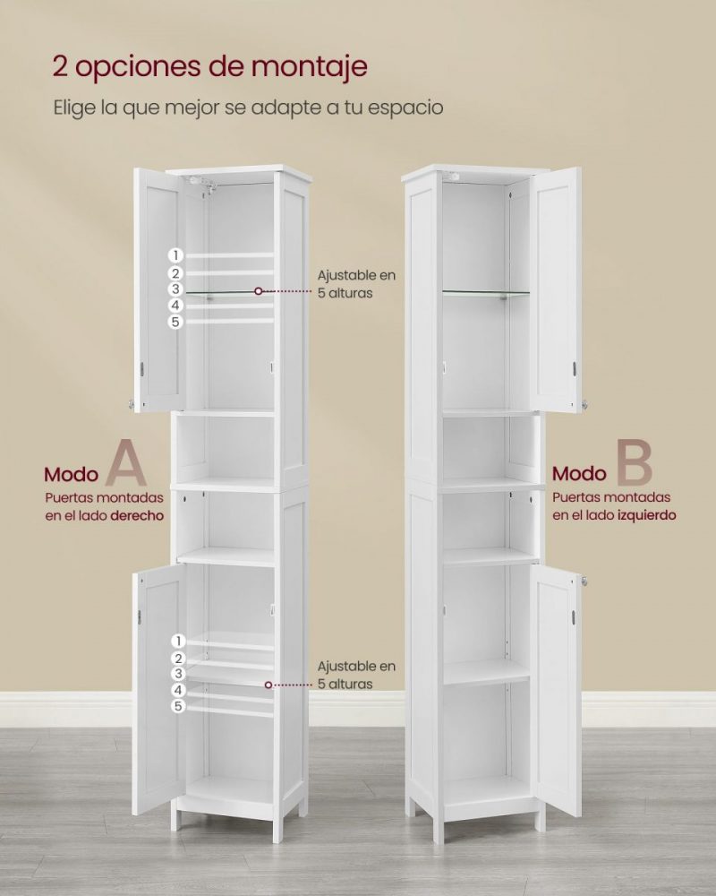 Estantes Ajustables: Dos compartimentos con estantes ajustables a 5 alturas diferentes para acomodar objetos de varios tamaños.