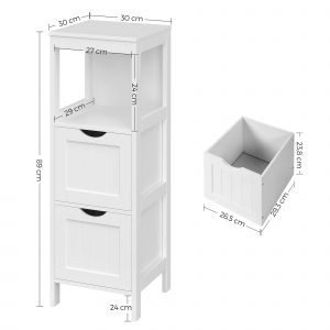 Con dimensiones de 30 x 30 x 89 cm, esta rinconera está diseñada para aprovechar al máximo el espacio reducido. Puedes colocarla en el cuarto de baño, el dormitorio o cualquier rincón, ofreciendo soluciones de almacenaje prácticas y estilizadas.