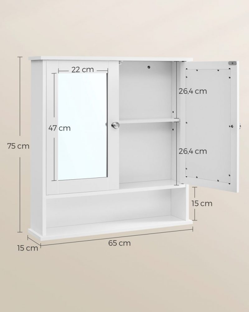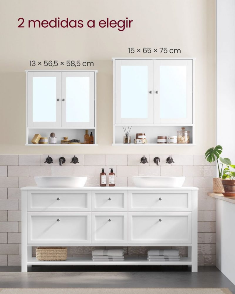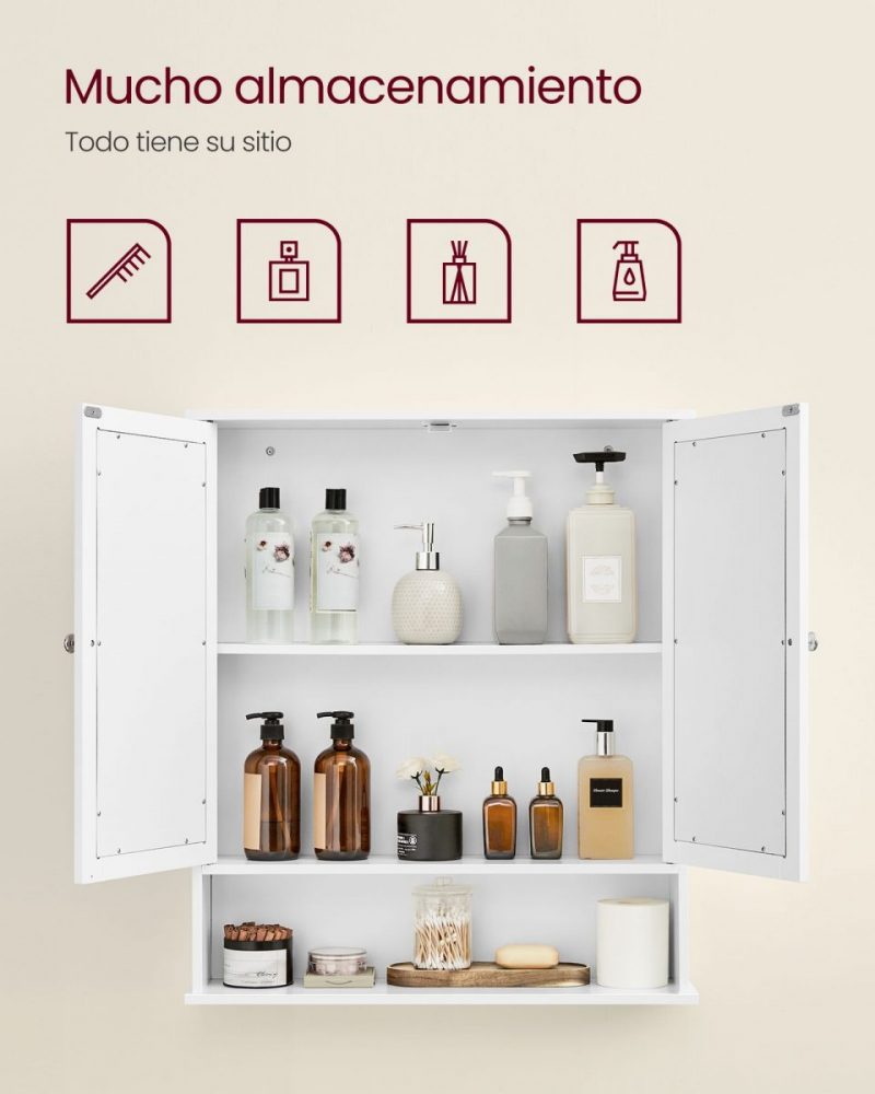 Puertas de Espejo Prácticas: Equipado con dos puertas de espejo, perfectas para afeitarse o maquillarse, comenzando tu día con funcionalidad y estilo.