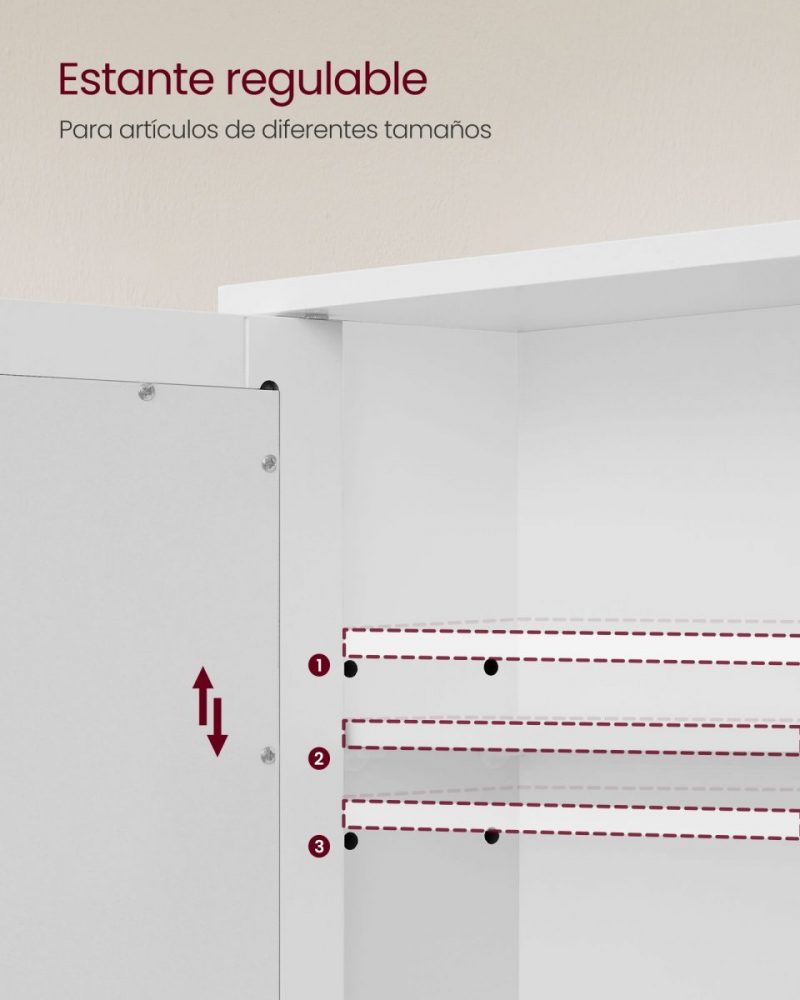 Estante Ajustable para Mayor Flexibilidad: El estante interno se puede ajustar en 3 niveles de altura, permitiéndote almacenar objetos de diferentes tamaños, desde un bote grande de champú hasta artículos más pequeños.