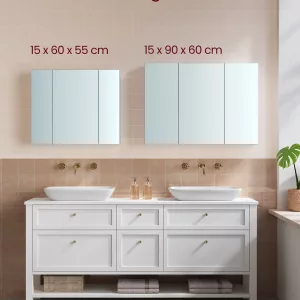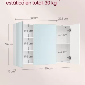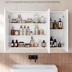 Amplio Espacio de Almacenamiento: Al abrir el gabinete, encontrarás 3 estantes ajustables en 3 alturas diferentes (2 a la izquierda y 1 a la derecha). Esto proporciona un espacio generoso para almacenar productos de cuidado personal, desde cremas y champús hasta papel higiénico, manteniendo todo en orden.