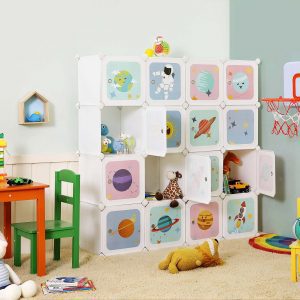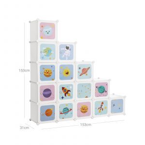 Con dimensiones de 30 x 30 x 30 cm por cubo, este armario de almacenamiento ofrece un hogar acogedor para juguetes, ropa y libros. Además, se puede convertir en un estante más grande al quitar un panel para almacenar objetos más altos.