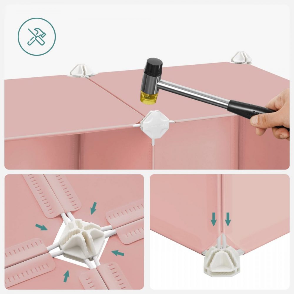 Construcción Robusta: Compuesto por una estructura de metal sólido, láminas de plástico PP resistentes y conectores reforzados, este armario es capaz de soportar hasta 10 kg por cubo. Además, incluye un dispositivo de fijación para asegurar la estabilidad y seguridad del mueble.