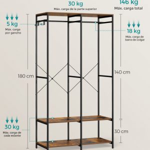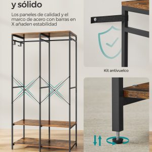 Este ropero no solo es elegante, sino también increíblemente duradero. Construido con una estructura metálica resistente y paneles de aglomerado de alta calidad, y reforzado con barras en X en la parte posterior, está diseñado para soportar hasta 146 kg. Es la solución perfecta para almacenar desde tus prendas más ligeras hasta las chaquetas de invierno más pesadas sin esfuerzo.