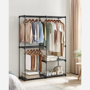 Con 3 secciones para colgar, incluyendo dos cortas y una larga con una altura máxima de 132 cm, este armario ofrece suficiente espacio para organizar desde camisas y chaquetas hasta vestidos largos y abrigos. Los estantes adicionales brindan el lugar perfecto para almacenar accesorios como bolsos, sombreros y calcetines, asegurando que cada artículo tenga su propio espacio.