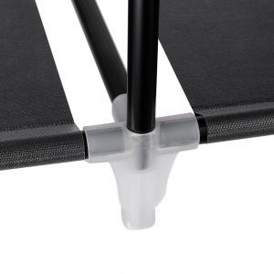 La estructura está compuesta por tubos de acero y uniones de plástico de alta calidad que ofrecen una gran estabilidad. Cada estante puede soportar hasta 5 kg cuando el peso se distribuye uniformemente, y la barra para colgar la ropa puede soportar hasta 15 kg.