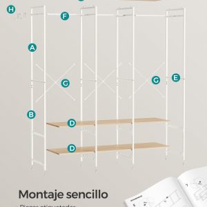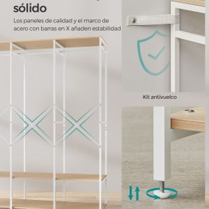 Equipado con patas ajustables, este armario plegable se adapta a suelos irregulares, y su kit antivuelco proporciona una seguridad adicional. Es una solución de almacenamiento robusta y confiable para tus prendas, asegurando que todo permanezca en su lugar.
