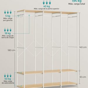 Este armario ropero no solo es una solución de organización eficaz, sino también un complemento elegante para cualquier habitación. Con dimensiones de 40 x 141 x 180 cm, ofrece un espacio amplio para guardar ropa, bolsos, maletas y mucho más. Su estante superior, la zona para colgar y los estantes inferiores están diseñados para una organización fácil y efectiva de tus prendas.