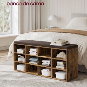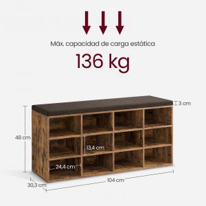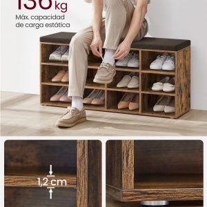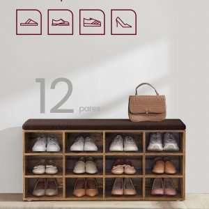 Banco zapatero asiento 12 compartimientos, cojín ajustable, marrón