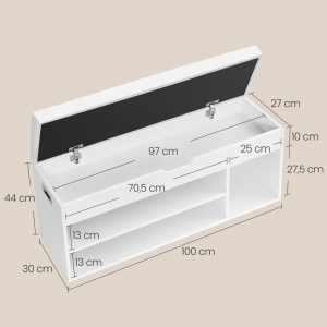 Con medidas de 30 x 100 x 44 cm (Profundo x Ancho x Alto), este banco ofrece un almacenamiento óptimo. Dispone de una caja de 7 cm de altura bajo el asiento para objetos como guantes o libros y compartimentos abiertos capaces de albergar hasta 8 pares de zapatos.
