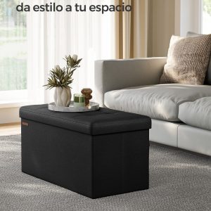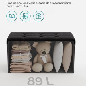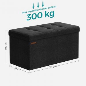 Con dimensiones generosas de 38 x 76 x 38 cm y una capacidad total de 89 L, este puff plegable ofrece amplio espacio para organizar sábanas, almohadas, mantas, revistas, y mucho más. Es la solución ideal para mantener tu hogar ordenado y tus objetos de valor a salvo y fuera de la vista.