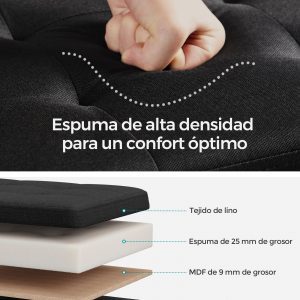 Este banco no solo destaca por su atractivo estético, sino también por su construcción de alta calidad. Los protectores metálicos en las esquinas y los tableros de MDF de alta densidad garantizan una resistencia y durabilidad excepcionales, con una capacidad de carga estática máxima impresionante de 300 kg. Además, el acolchado de espuma de alta densidad proporciona un asiento cómodo, soporte y transpirabilidad sin igual.