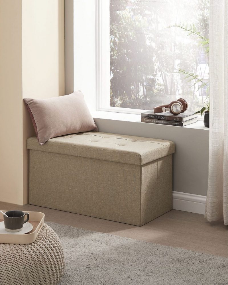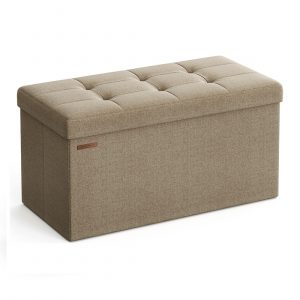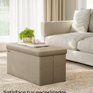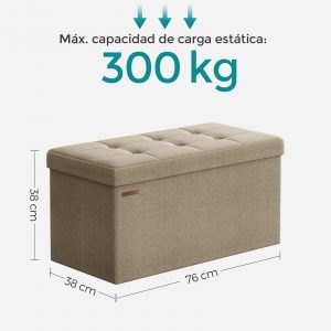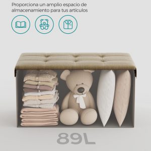Con dimensiones generosas de 38 x 76 x 38 cm y una capacidad total de 89 L, este puff plegable ofrece amplio espacio para organizar sábanas, almohadas, mantas, revistas, y mucho más. Es la solución ideal para mantener tu hogar ordenado y tus objetos de valor a salvo y fuera de la vista.