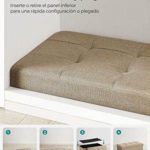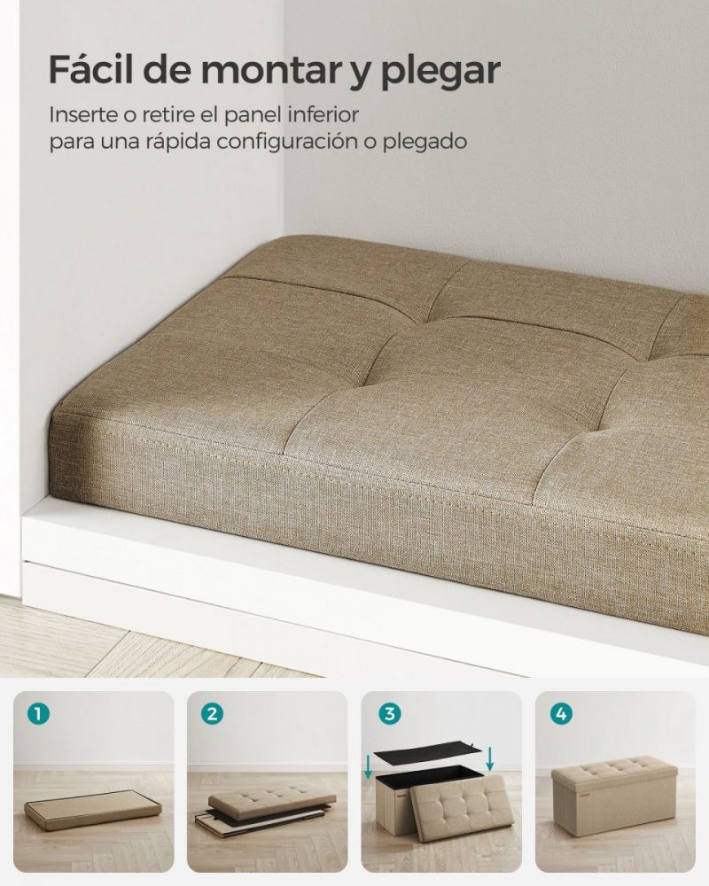 Gracias a su innovador diseño plegable, este banco de almacenamiento se monta en cuestión de segundos, permitiendo un uso inmediato. Cuando no se necesita, se pliega de manera compacta para almacenarse fácilmente, optimizando el espacio en tu hogar.
