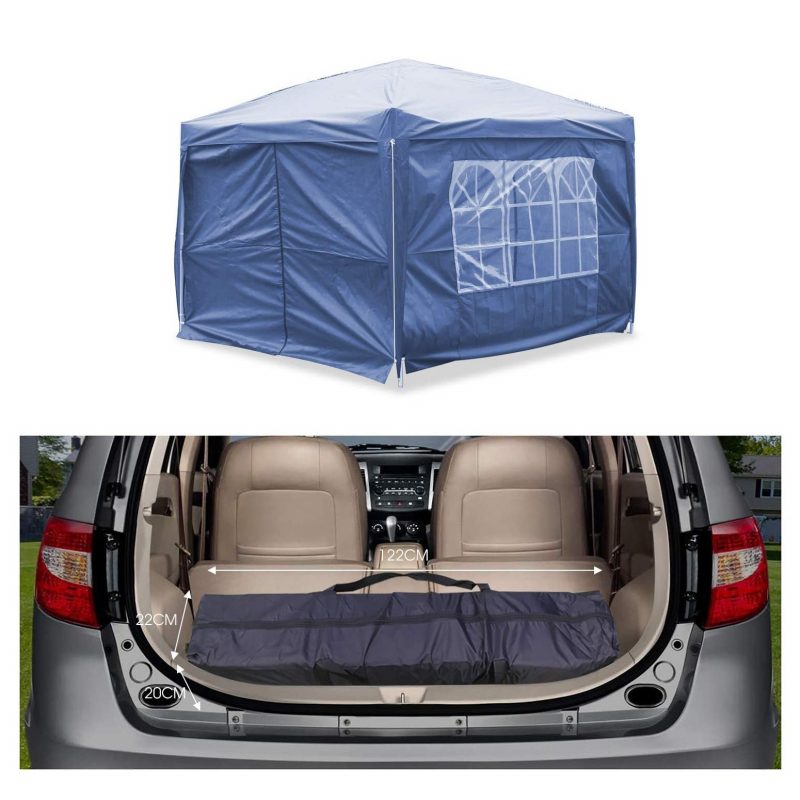 Esta carpa plegable color azul, con paredes desmontables y ventanas, repelente al agua y cortavientos te protegerá del sol con más de 50+ protección UV.