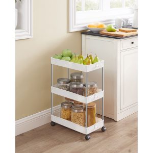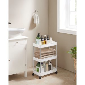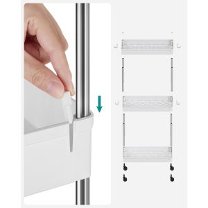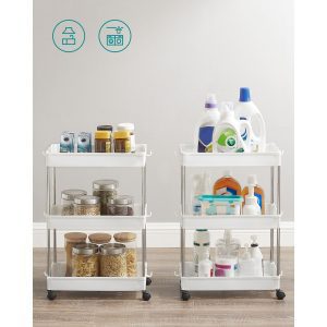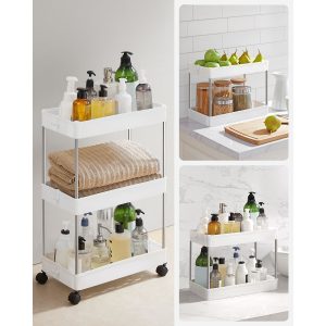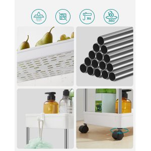 Este carrito no solo es práctico, sino también fuerte. Con sus patas de metal resistentes y estantes de PP impermeables y duraderos, puede almacenar hasta 5 kg por estante, ideal para alimentos, bebidas, botellas, tarros, y productos de baño grandes.