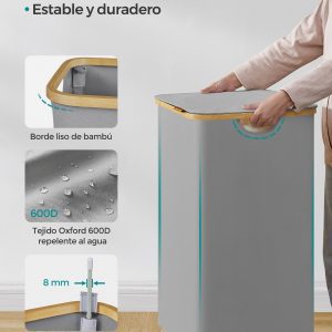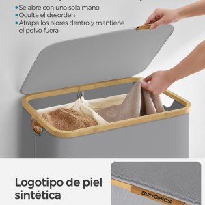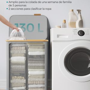 2 Amplios Compartimentos: Este cesto para ropa sucia cuenta con dos compartimentos espaciosos, con un total de 130 litros de capacidad. Con dimensiones de 52 x 38,5 x 70,5 cm, está diseñado para facilitar la clasificación y almacenamiento de la ropa de una familia, ayudándote a mantener todo organizado y listo para lavar.