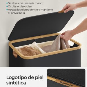 2 Amplios Compartimentos: Este cesto para ropa sucia cuenta con dos compartimentos espaciosos, con un total de 130 litros de capacidad. Con dimensiones de 52 x 38,5 x 70,5 cm, está diseñado para facilitar la clasificación y almacenamiento de la ropa de una familia, ayudándote a mantener todo organizado y listo para lavar.
