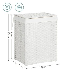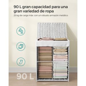 Con unas dimensiones de 46 x 33 x 60 cm y una capacidad de 90 litros, nuestro cesto ofrece amplio espacio para almacenar ropa sucia sin ocupar demasiado lugar, ideal para baños, dormitorios o lavaderos con espacio limitado. Su tapa fácil de abrir con una sola mano mantiene la ropa oculta, ayudando a contener olores desagradables y a mantener a las mascotas alejadas.